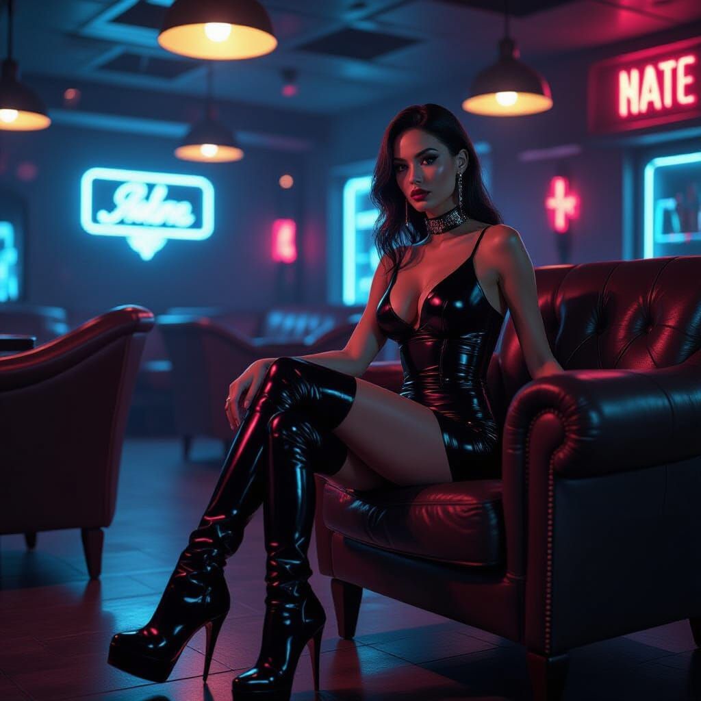 This image shows a poised woman in a futuristic dress and boots sitting in a dimly lit nightclub with neon accents. The scene has a noir-futurist atmosphere in a cyberpunk aesthetic.
