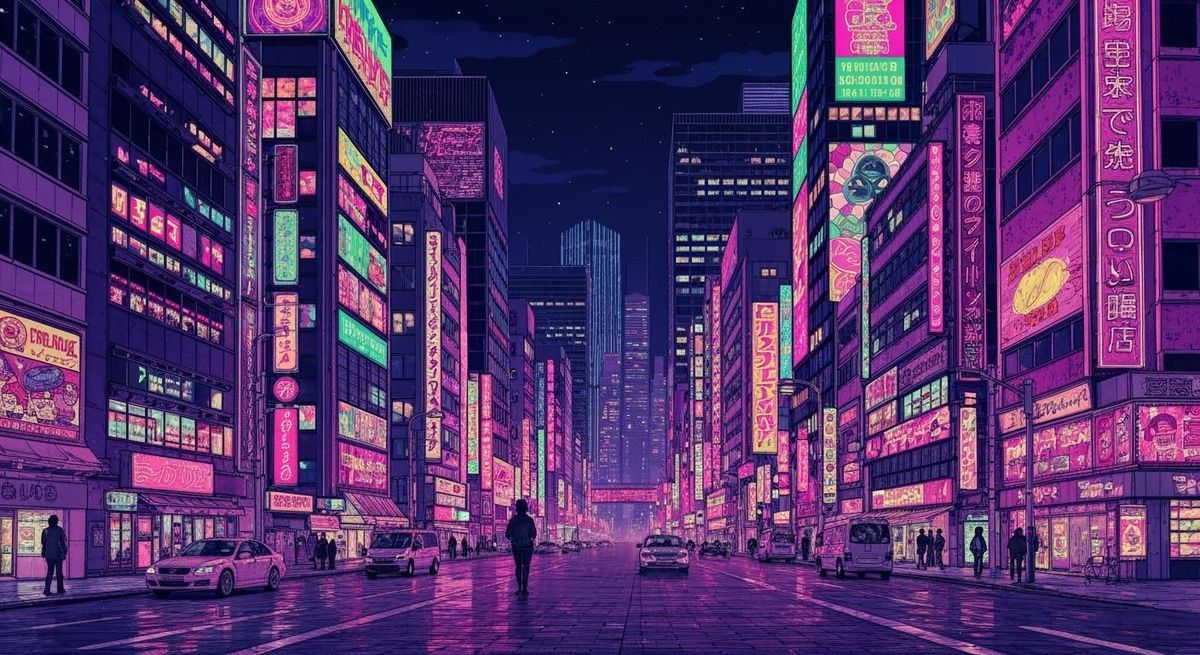 This image shows a neon-lit cityscape blending Shibuya's nightlife with Harajuku's fashion. The image is an homage to pop art and modern Japanese urban culture.