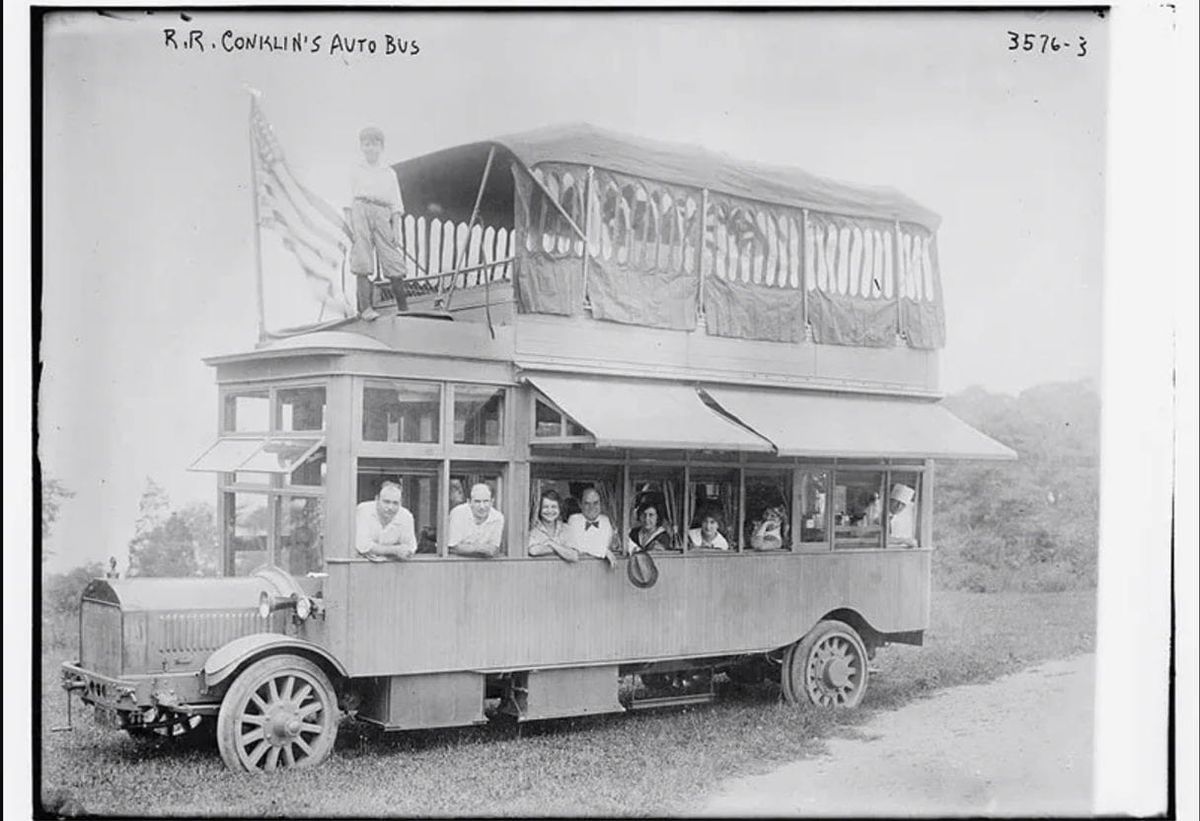 This image shows an old-fashioned poster advertising Roland Conklin's Gas-Electric Motor Bus Company's early 20th-century motorhome. The poster has a vintage aesthetic.