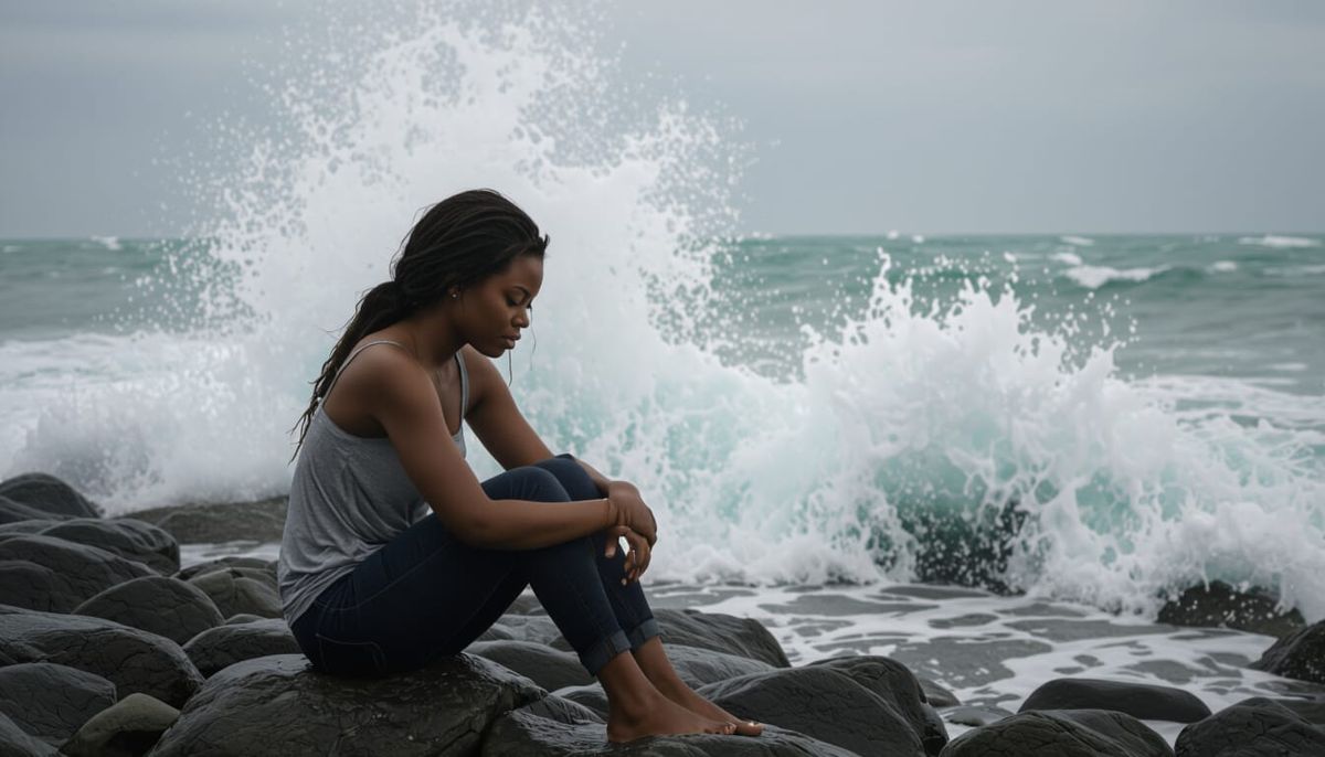 This image depicts an African American woman sitting on a rocky shore as waves crash around her. The overcast lighting adds to the somber mood of the scene.