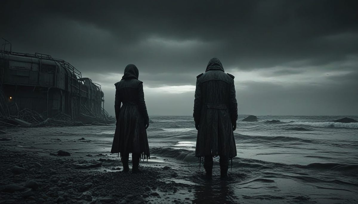 This haunting image captures a lone figure floating in a desolate, oil-slicked ocean, surrounded by eerie bioluminescence and ominous, gritty textures reminiscent of a dystopian nightmare.