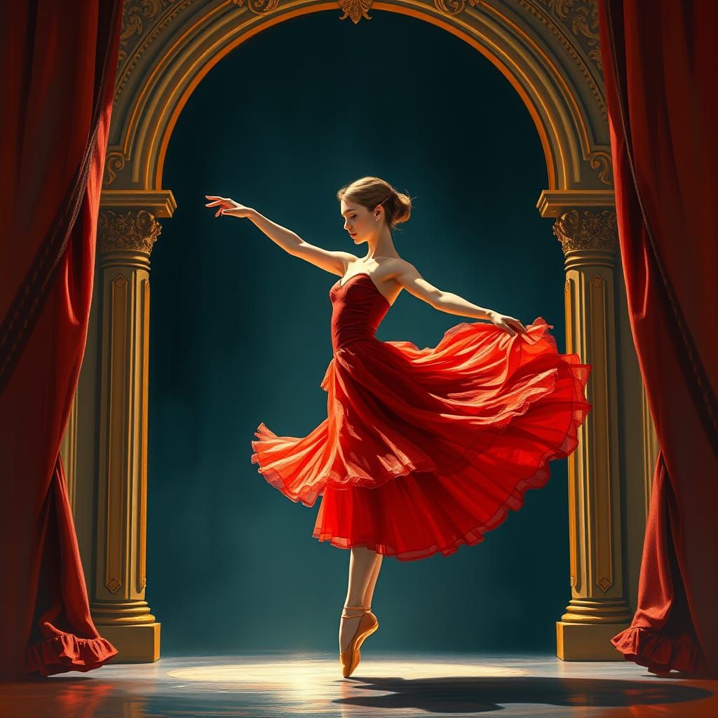 This image shows a beautiful ballerina dancing en pointe on a grand stage, surrounded by luxurious curtains and a soft spotlight. The delicate, feathery brushstrokes and vibrant colors evoke the style of Impressionist and Pre-Raphaelite art, with a sense of movement and energy.