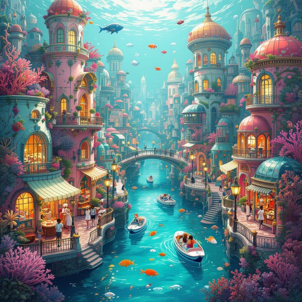 This image shows Neptunia, a thriving underwater city with coral buildings and glass streets. Inhabitants with gills live alongside fish, and autonomous boats travel a river flowing through the city, in a dreamy ethereal style.