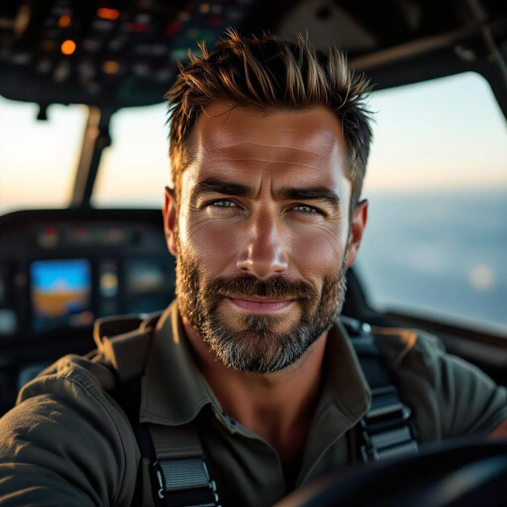 This hyperrealistic image shows an attractive, muscular man piloting a plane, captured with dramatic, moody lighting and lens flare, reminiscent of a high-octane thriller movie still.