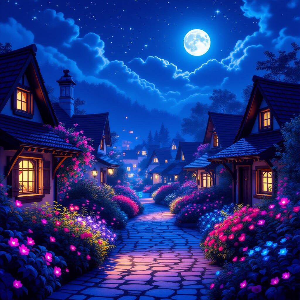 This image showcases a tranquil night village surrounded by luminous, colorful gardens under soft moonlight. Rendered with photorealistic detail and cinematic lighting, it evokes a sense of magic and peace.