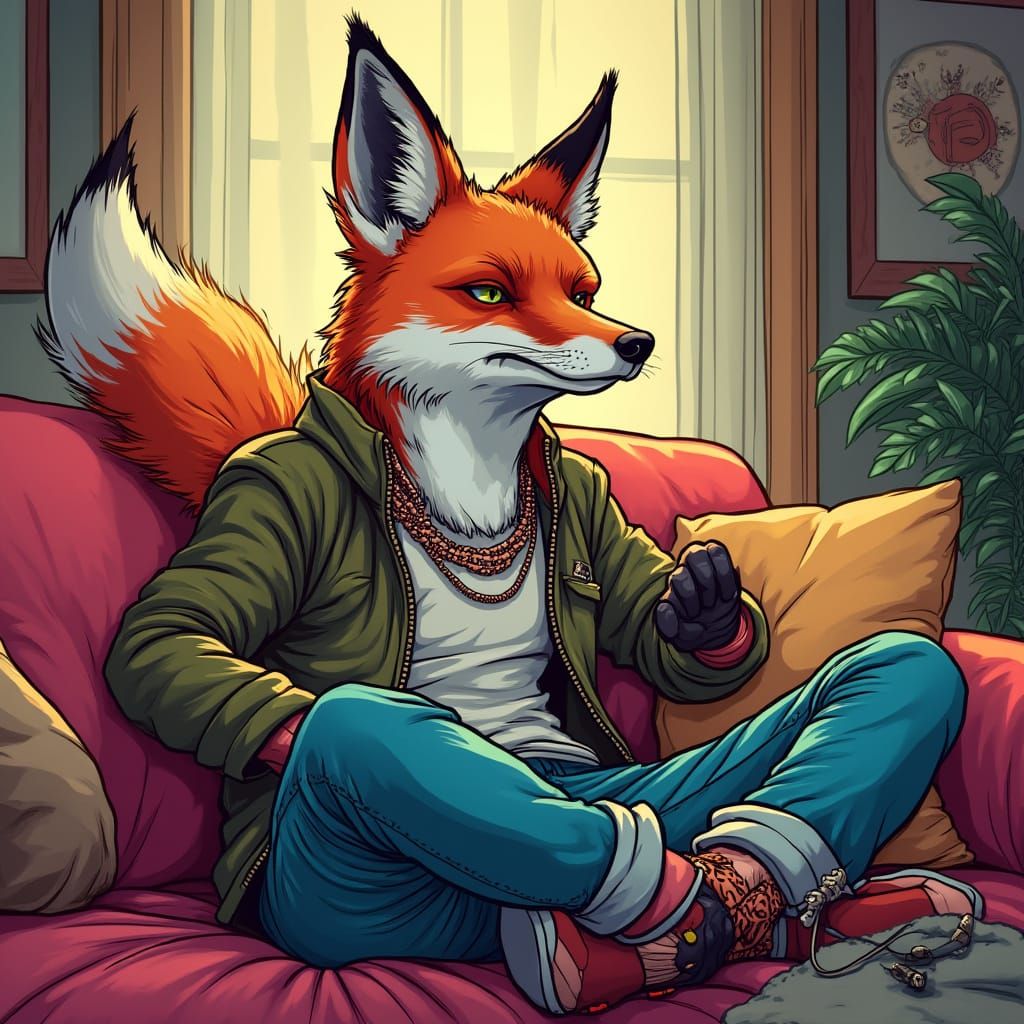 A fox in stylish attire enjoying psytrance music in a relaxed setting. The image presents a caricature-style illustration with vibrant colors and bold lines, evoking a comic book aesthetic.