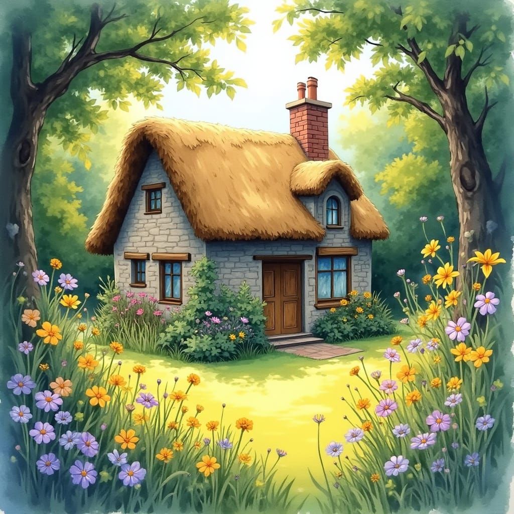 A vibrant watercolor painting of a cozy cottage in an overgrown garden, bathed in warm sunlight. Loose brushstrokes depict wildflowers and rustic charm, creating a peaceful, idyllic scene.