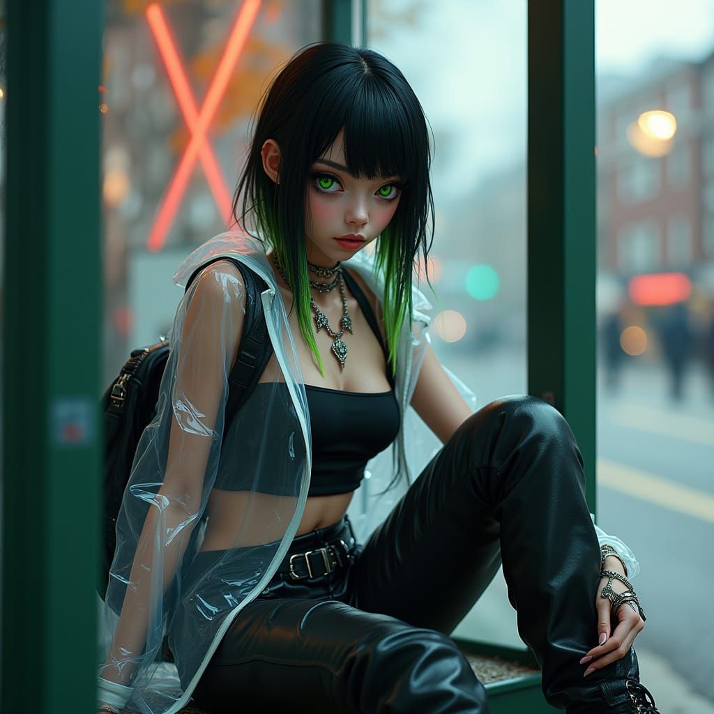 A hyperrealistic digital portrait of a slender 19-year-old woman with punk-style black hair sitting at a bus stop. She wears a rain jacket and leather pants, rendered with meticulous detail.