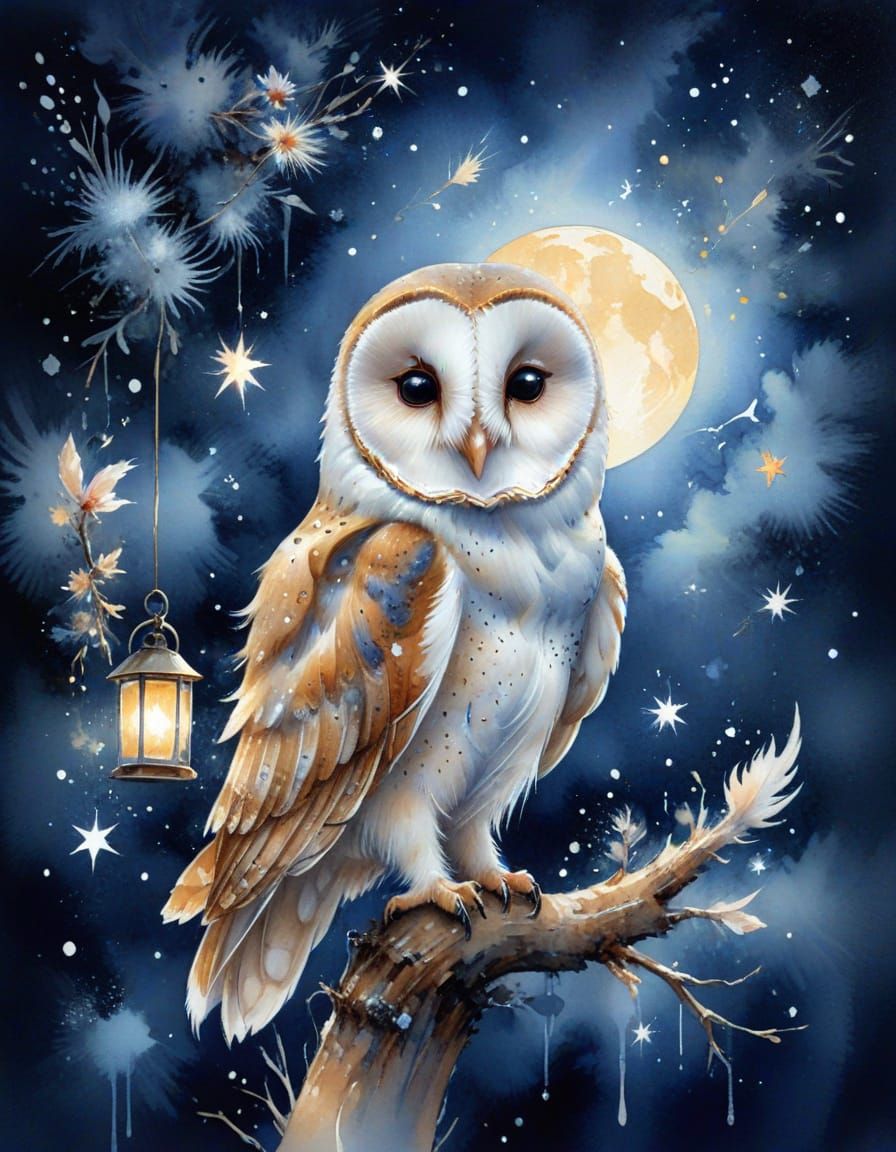 This image shows a cute chibi barn owl with large eyes and cream feathers, holding a lantern while floating in a dreamy indigo night sky. It has a watercolour aesthetic.