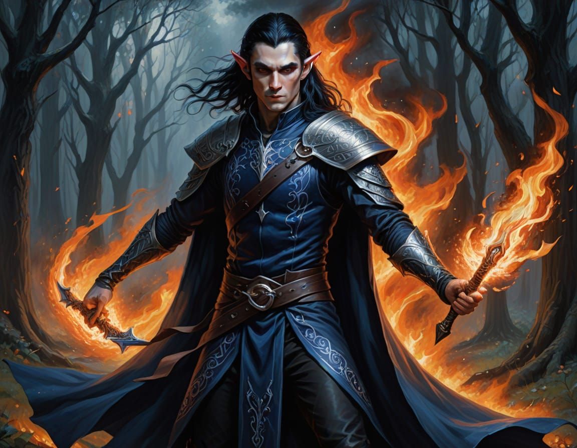 A striking picture of a handsome, athletic, hairless male elf exhaling a cone of fire. He is wearing blue mage silk clothes and wielding an elven sword, depicted as an oil painting.