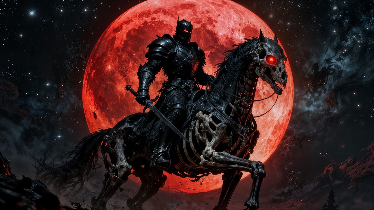 This dark fantasy concept art features a black knight on a skeleton horse beneath a blood-red full moon. The image showcases hyper-detailed, intricate elements with dynamic and volumetric lighting, rendered in 8k resolution.