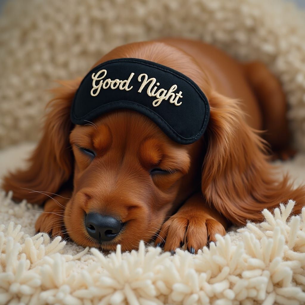 A photorealistic image presents a sleeping red cocker spaniel puppy wearing a sleep mask. The scene evokes a hyperrealistic style with elements of whimsy.