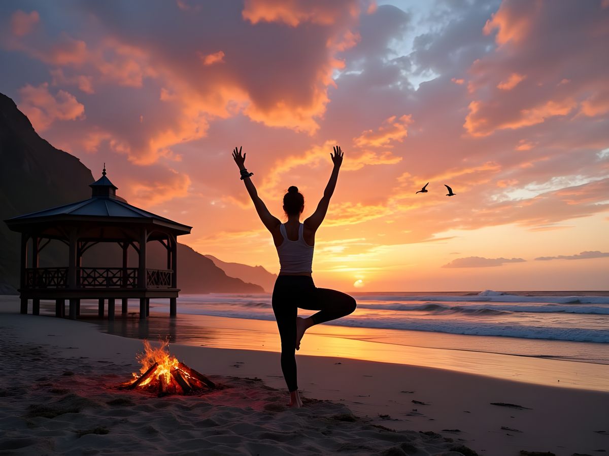This image shows a yoga practitioner in a standing pose on a beach at sunset. Crags are visible in the distance, and a banner flaps in the breeze.