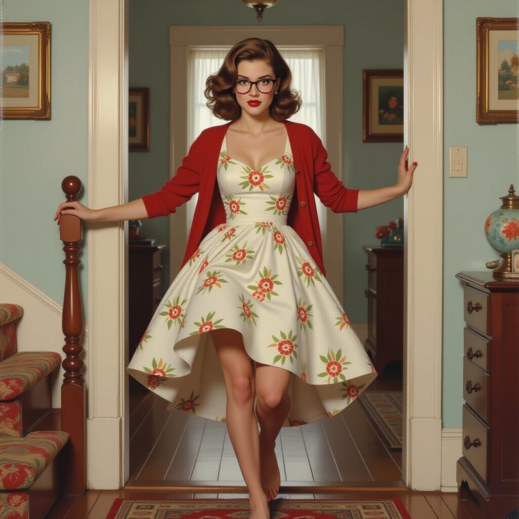 This image depicts a young woman in a vintage prom dress carefully tip-toeing upstairs after a date. Painted in a detailed, narrative style with soft lighting, capturing an authentic emotional moment.