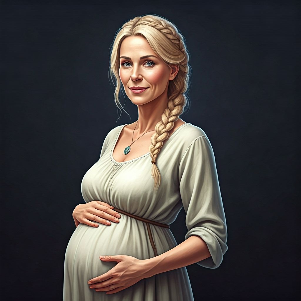 This image shows a woman with blonde hair and blue eyes, appearing calm and strong. She is pregnant, wearing light, comfortable clothing, and often rests her hand on her belly.