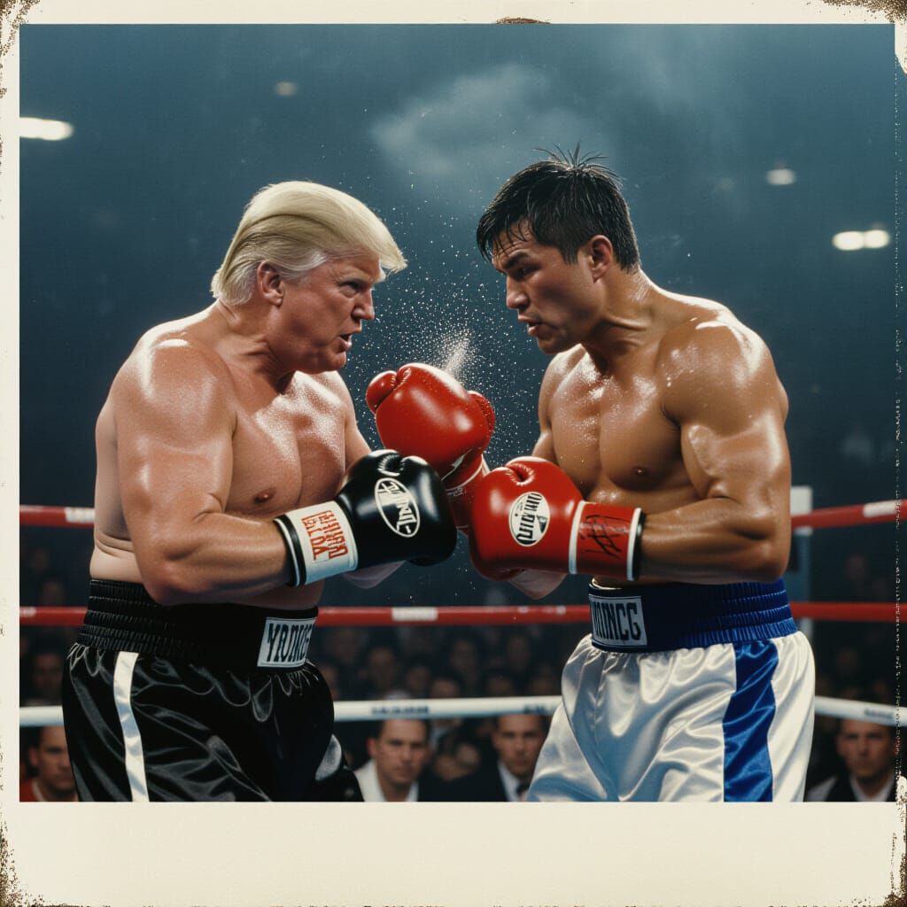 This image shows Donald Trump and Lawrence Wong in an intense boxing match within a dimly lit, smoke-filled arena. The gritty, cinematic style features dramatic lighting.