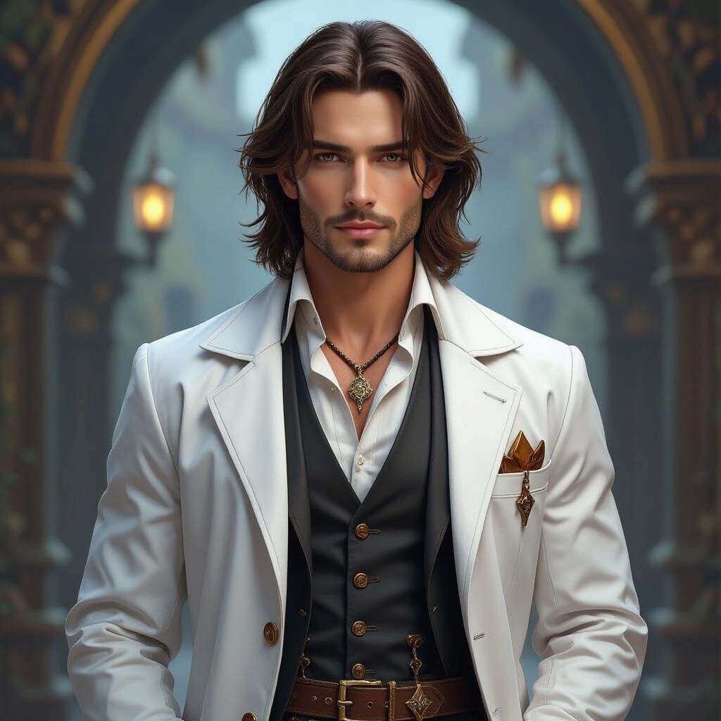 A handsome half-elf man in elegant attire and a doctor's coat, set in a D&D world. This fantasy concept art features deep colors and intricate details, rendered with a grand splash screen aesthetic.
