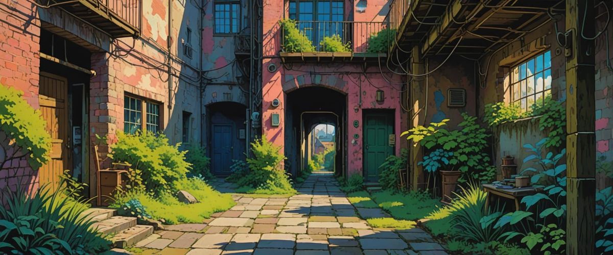 This image shows abandoned factories in an industrial wasteland with graffiti under a bright sky. The scene is rendered in a comic book style with watercolor effects, vibrant colors, and detailed textures.