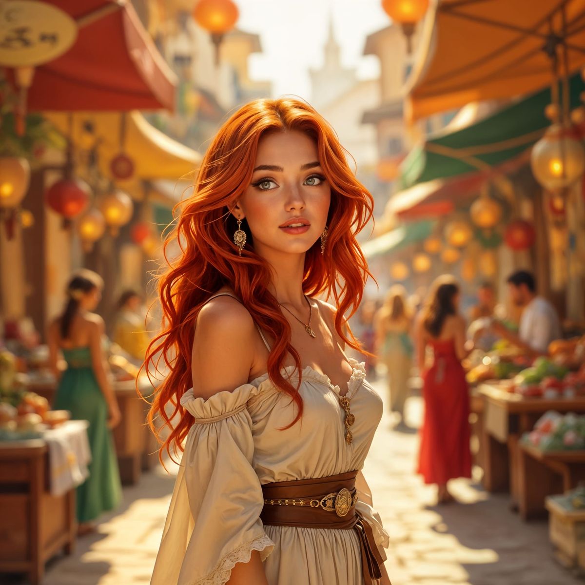 A vibrant marketplace scene in a fantastical city. A young woman with red hair explores the exotic wares and strange creatures in a painterly style, reminiscent of art nouveau, with warm colors and soft lighting.