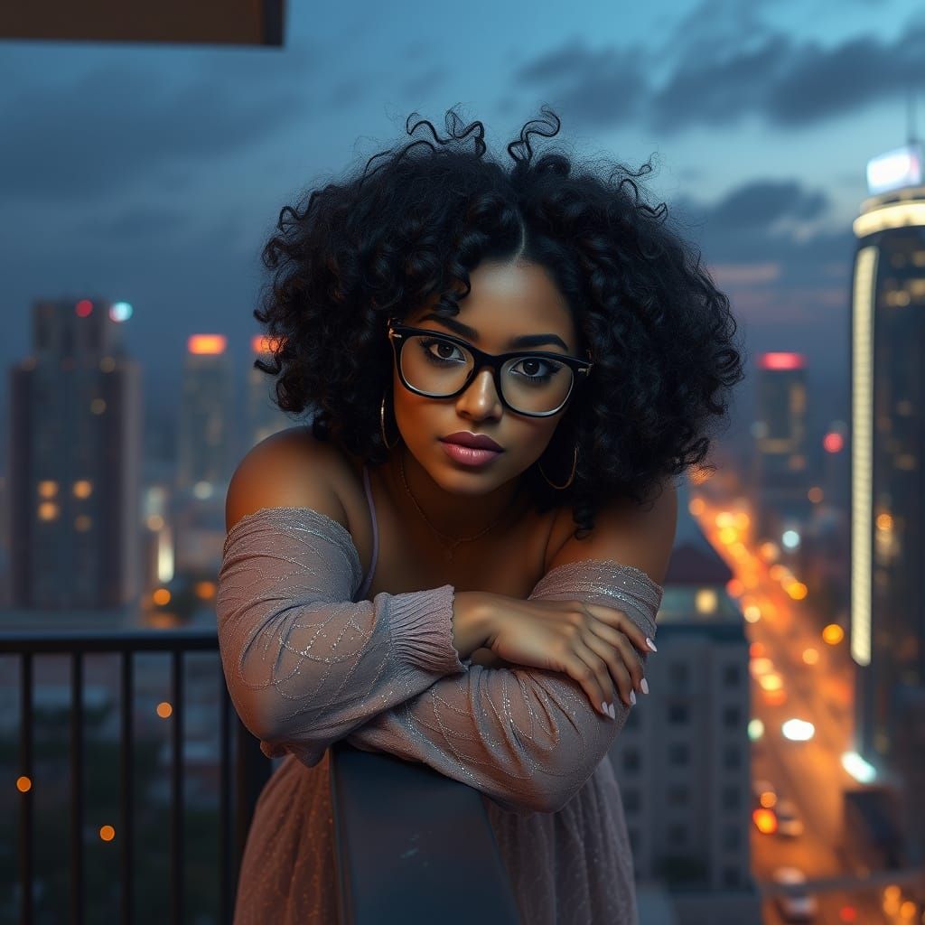 A striking picture of an Indian woman on a balcony at twilight. She has curly hair, glasses, and wears a shimmering outfit. The cityscape glows with warm lights in detailed matte painting style.