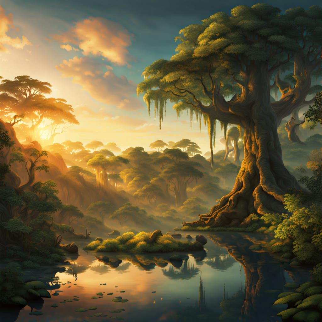 This digital matte painting captures the Amazon rainforest at golden hour. A serene lagoon reflects the dense canopy while ethereal vapor drifts, creating a mystical and tranquil atmosphere.