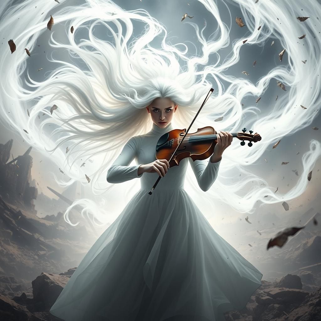This image depicts Vanya Hargreeves amidst a display of her powers. White light emanates from her as the world around her crumbles. The scene is lit with dramatic chiaroscuro lighting.