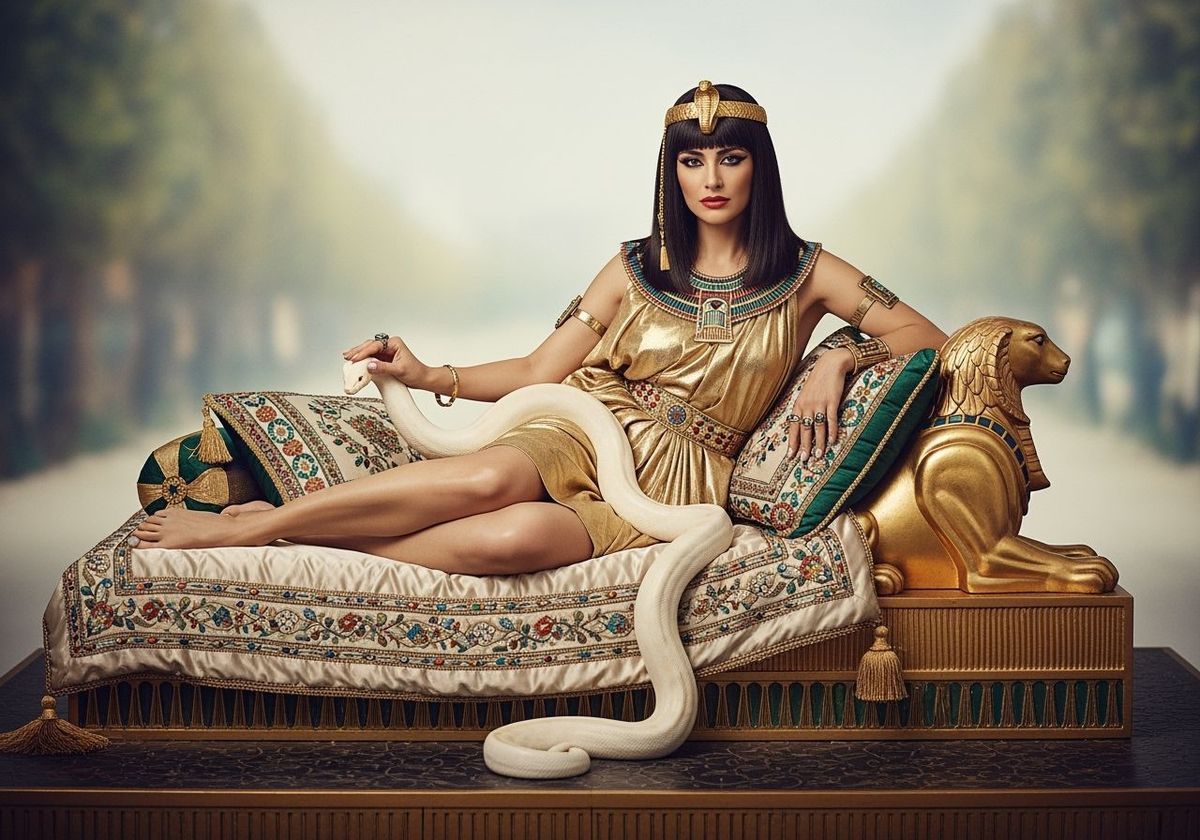 A stunning photograph of an Egyptian queen resting on a sphinx-shaped chaise lounge. She wears a gold toga and cobra crown, accompanied by a white snake, captured with soft focus and natural light.