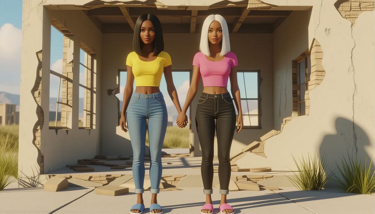This image shows two African women with sad expressions outside an unfinished building. Rendered in a hyper-realistic animated style with cinematic lighting and volumetric fog.