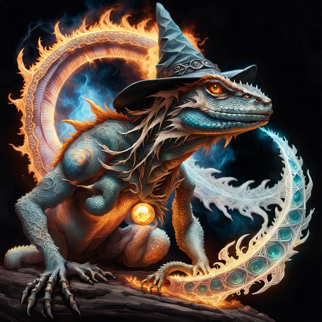 A vibrant image of a giant frost lizard embodying both moon witch and sun wizard. The lizard sculpts fire with magic against an iridescent fire storm backdrop. The image is rich with deep colors and opalescent highlights.
