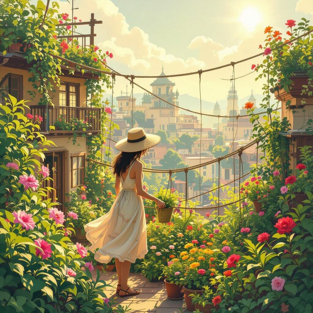 A vibrant rooftop garden tended by a young woman. Lush greenery and exotic flowers fill the secret world above a bustling city, connected by rope bridges. In a whimsical, painterly style with warm, soft lighting.