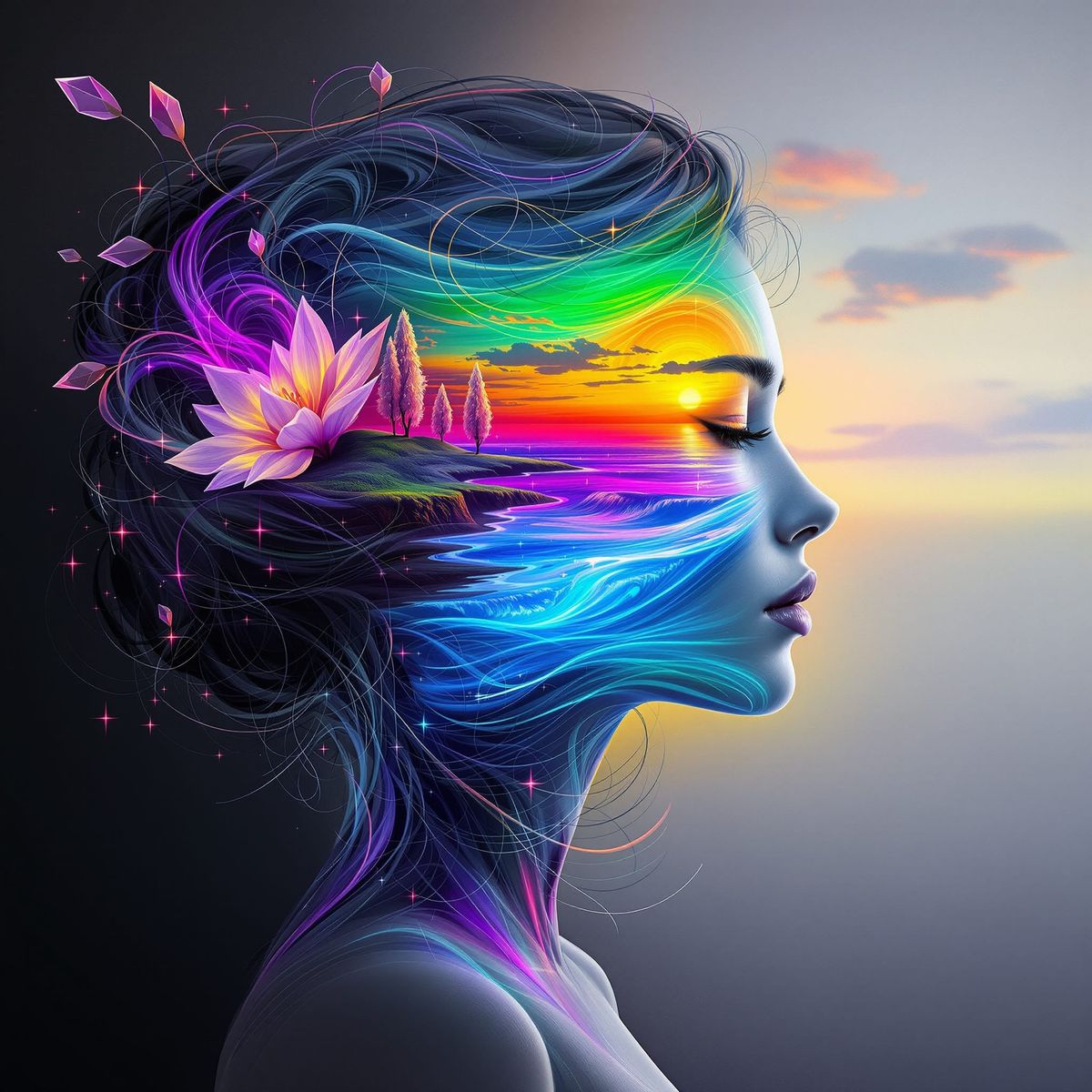 This digital painting features a woman's profile where her hair morphs into a cosmic landscape with neon waves, a vibrant sunset, and crystalline trees. It's a visionary artwork blending human form with nature in a surreal, dreamlike style.