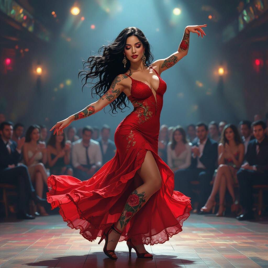 A striking image of a tango dancer in a red dress, captured on a dimly lit stage. The artwork blends a futuristic neon aesthetic with vibrant brushwork and moody digital painting.