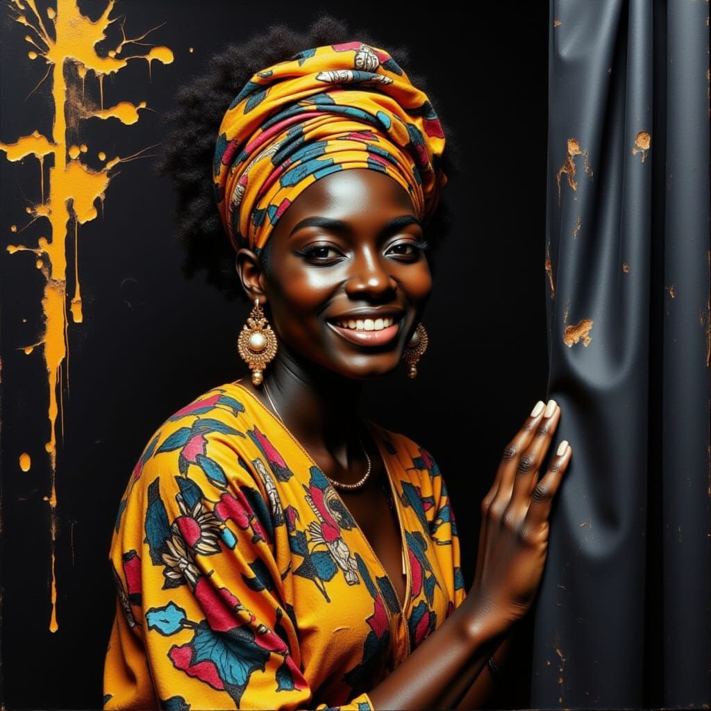 A vibrant watercolor and acrylic image of a beautiful African American woman in traditional African attire. The studio lit portrait emphasizes intricate patterns and jewelry, set against a partially obscured backdrop.