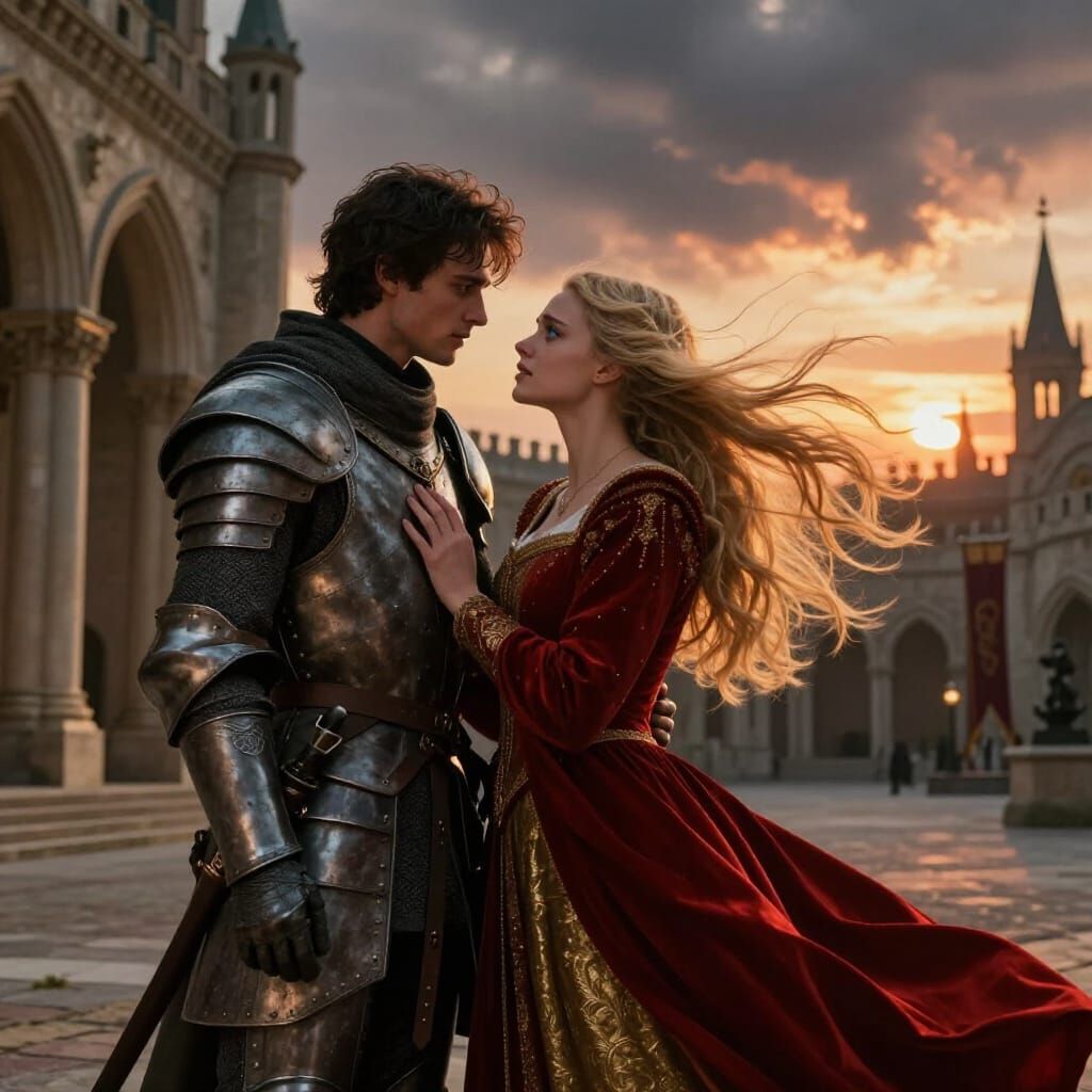 A young woman in a medieval gown and a knight in armor share a moment of tragic love in a grand palace courtyard at sunset. Dramatic lighting and wind enhance the emotional scene.