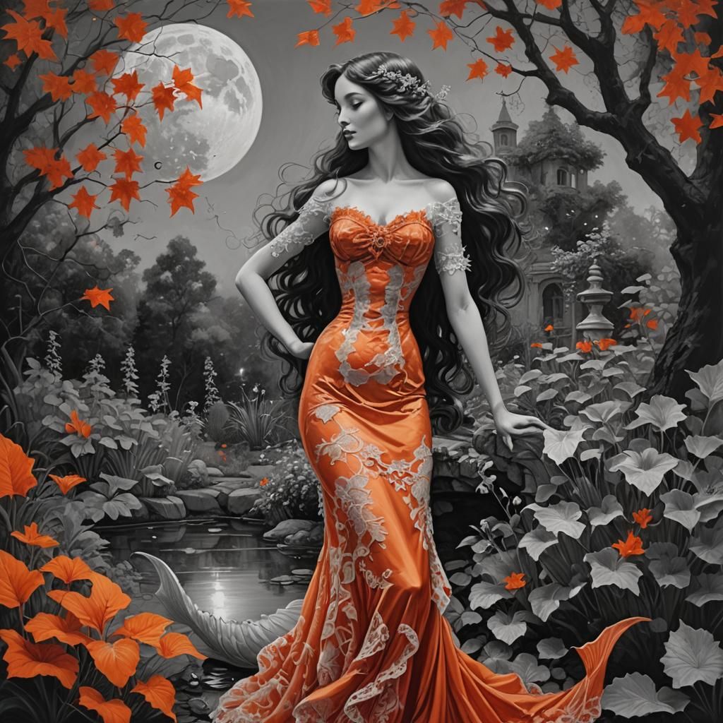 A striking picture of a mermaid in a garden under a monochrome orange sky. The mermaid is wearing a long lace and satin dress, rendered as an oil painting.