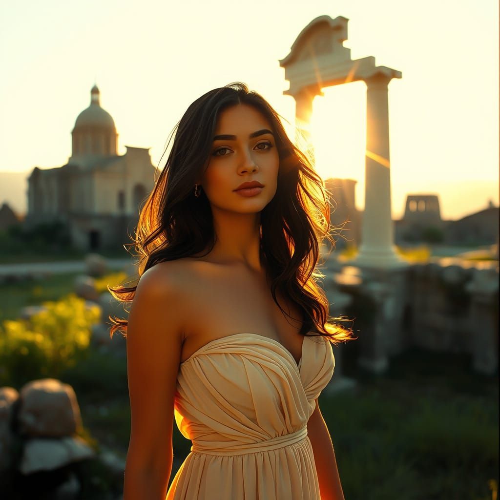 A cinematic portrait of a woman with dark hair in an elegant gown, standing among ruins in golden sunlight. The image evokes classic film aesthetics with grain and color grading.