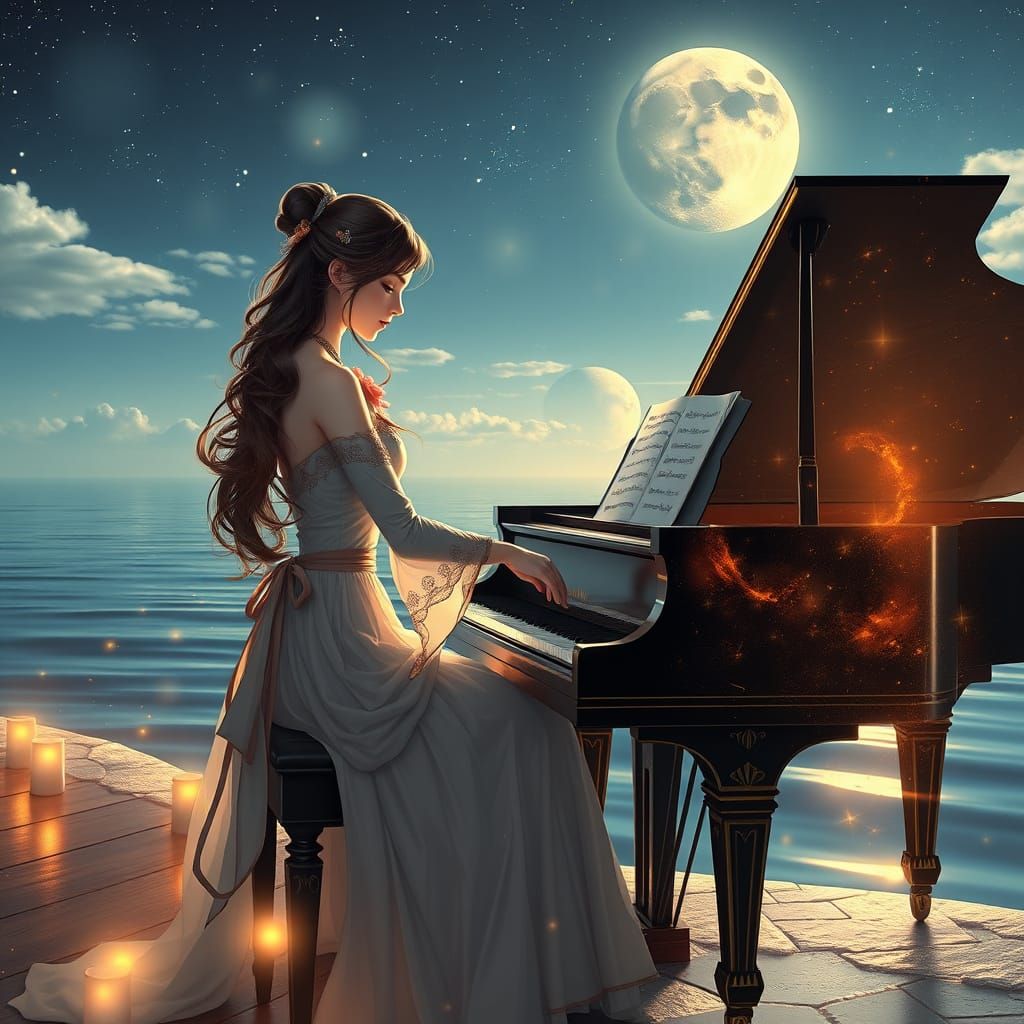 A mystical female pianist composing music. The sea reflects the moon and stars with a golden glow, all in a fantasy style with hyper-realistic details in oil painting. The world disappears..