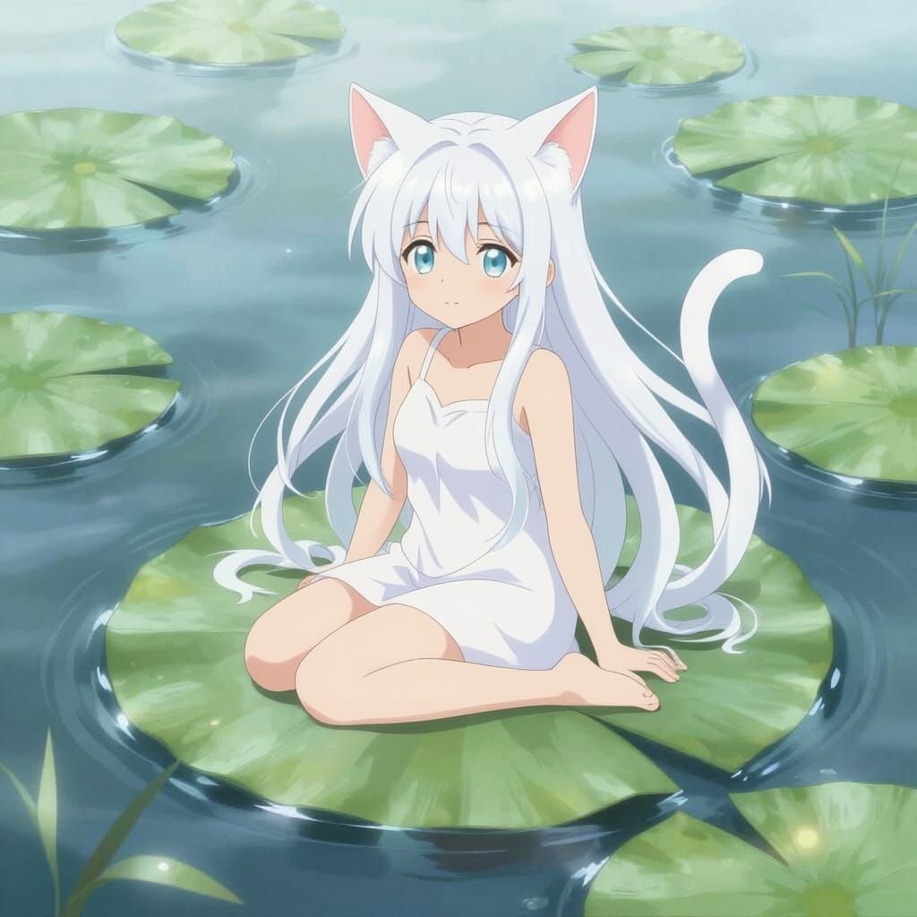 This image features a beautiful anime girl with white hair, gracefully seated on a lily pad in a serene, aesthetic pond.