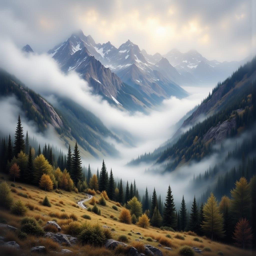 A serene mountain landscape featuring misty low clouds that accentuate the rugged peaks and valleys. The image evokes a blend of atmospheric styles, reminiscent of antique watercolor paintings.