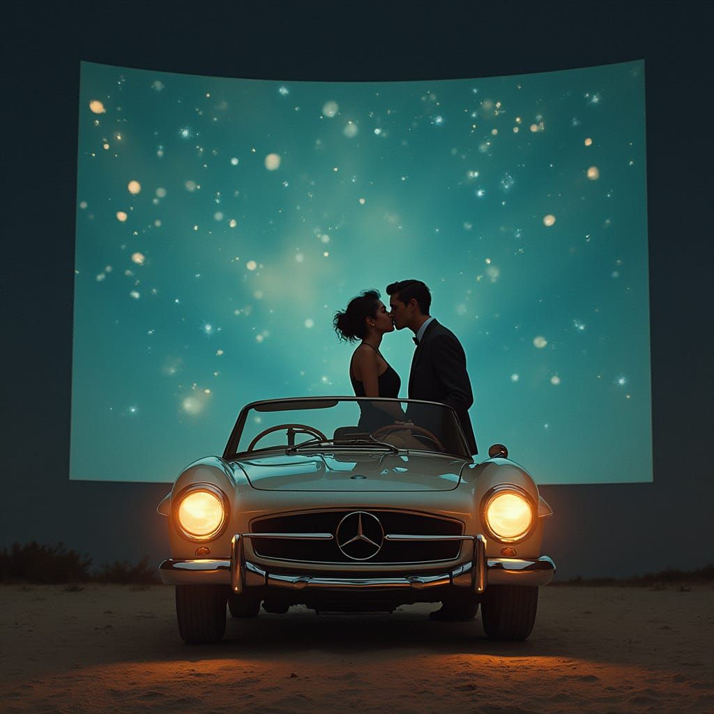 This image shows a vintage Mercedes car with a couple kissing under a starry sky projected on a cinema screen. The scene is reminiscent of art nouveau with futuristic and whimsical touches.