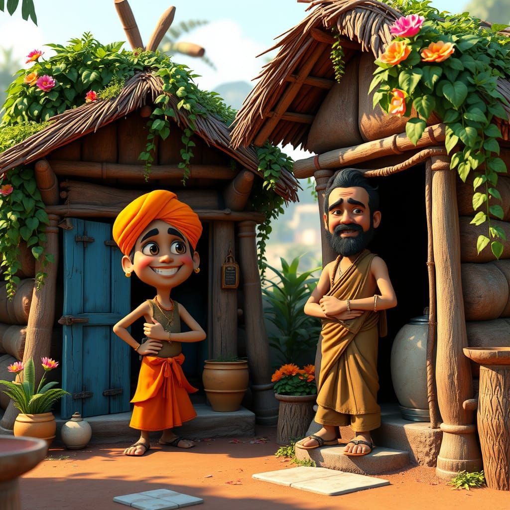 This colorful 3D image captures a lively Indian village scene, reminiscent of Pixar's aesthetic, with intricate textures and bold colors. Two neighboring huts are adorned with lush greenery and vibrant flowers, set amidst a bustling village atmosphere, with a happy farmer and a sleepy farmer enjoying the...