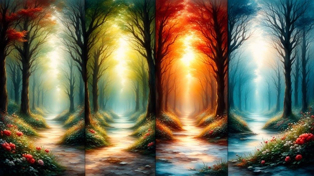 This image showcases the Bagatelle gardens in Versailles across four seasons, rendered in a hyperrealistic antique watercolor style with subtle bioluminescent flora and ethereal lighting.