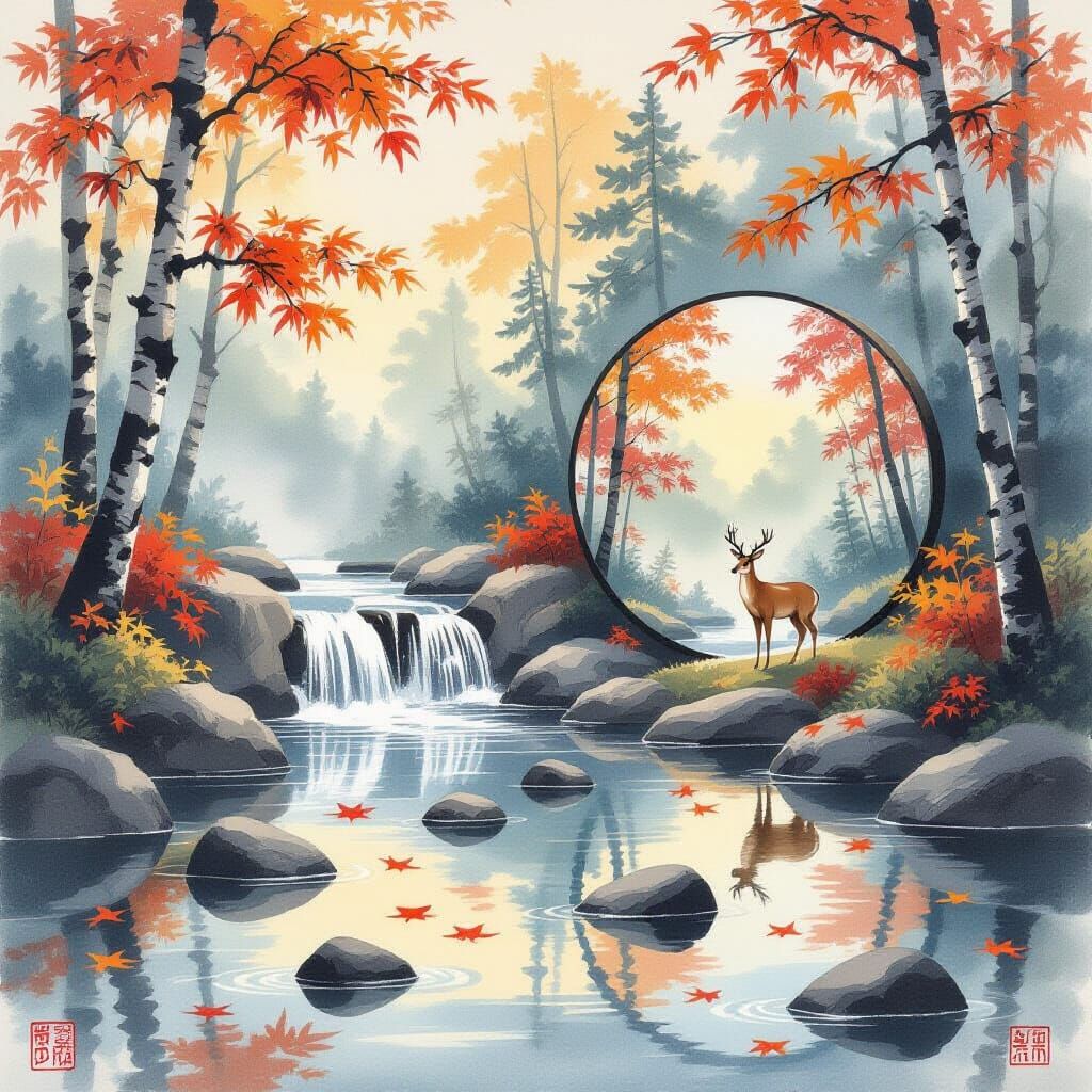 This image showcases a tranquil Japanese ink wash painting of a forest stream with autumn leaves. A deer stands beside a reflective mirror, capturing a serene, meditative mood.