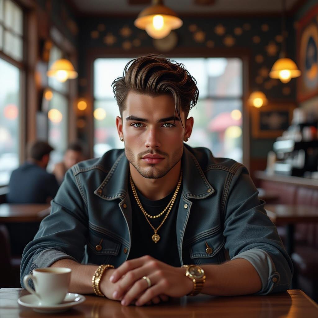 This image shows a handsome grunge man with jewelry in a cafe adorned with constellations. Rendered in a hyperrealistic digital matte painting style with cinematic lighting and magical glowing accents.