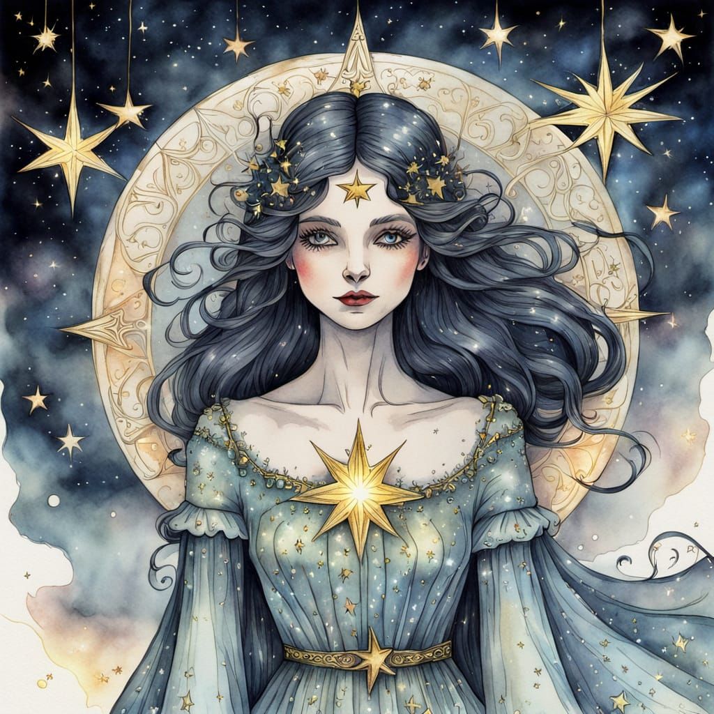 This image shows a close-up tarot card illustration of the Star card, featuring a woman in a long dress. It has a whimsical, gothic romantic aesthetic with golden lighting.