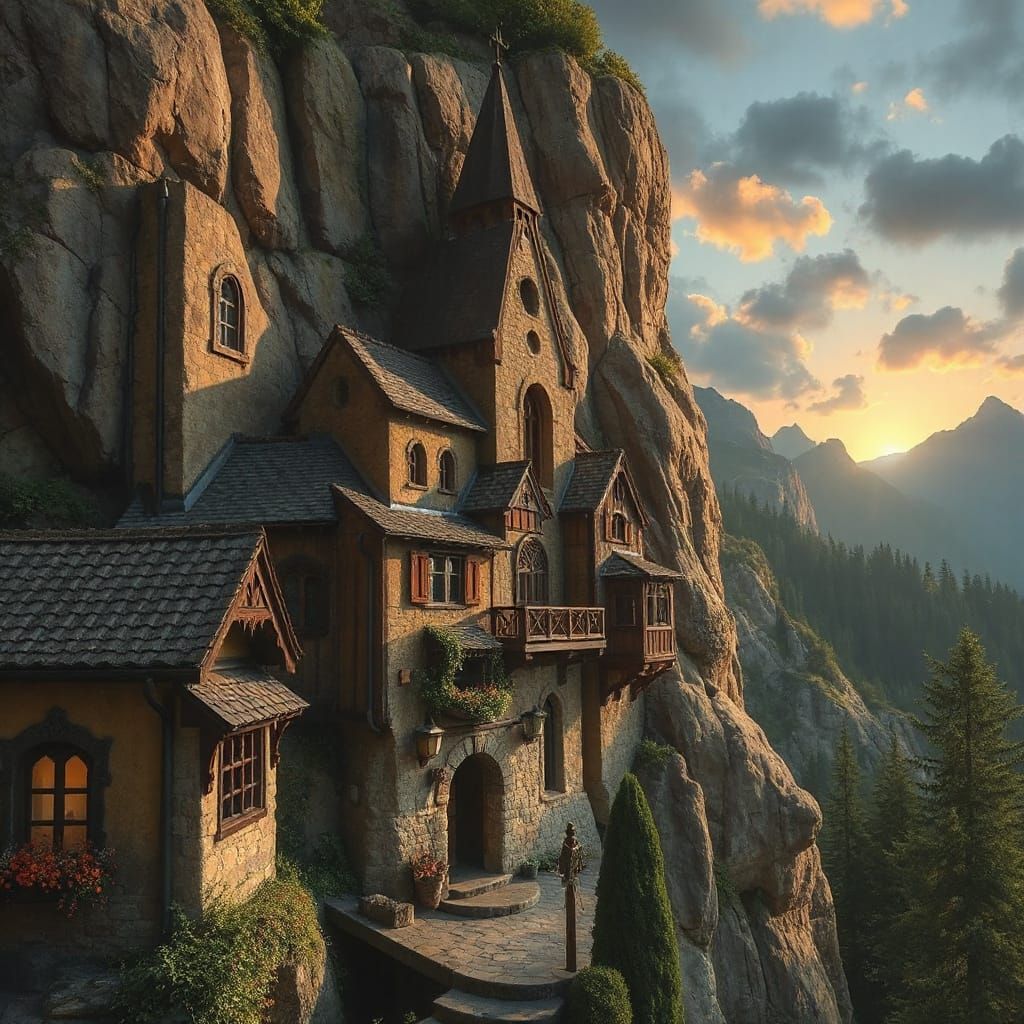 A quaint village with a charming church sits atop a rugged cliffside. The image evokes a whimsical and fantastical style using warm earthy tones and intricate details.