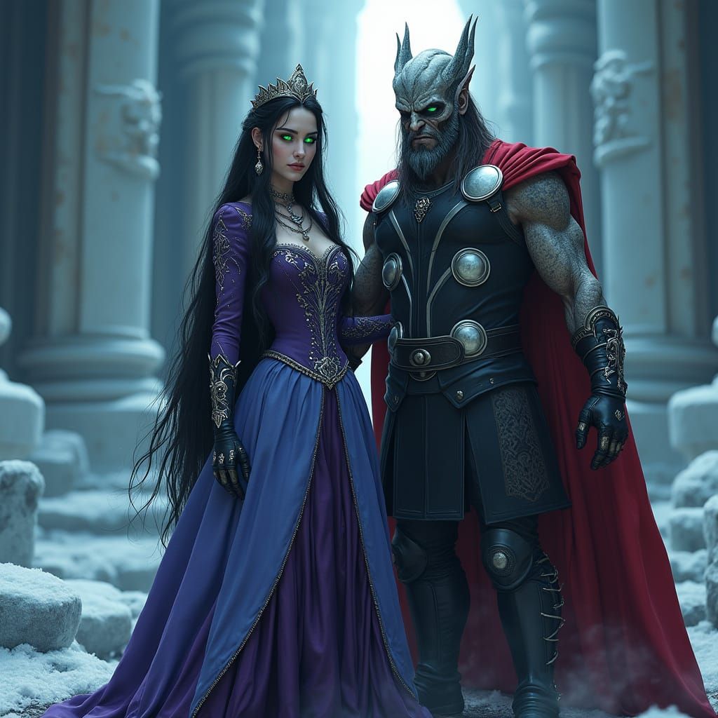 This image depicts Queen Karnilla and a decaying zombie Thor within a majestic ice palace. She sports vibrant black hair, a silver tiara, and a striking Victorian gown.