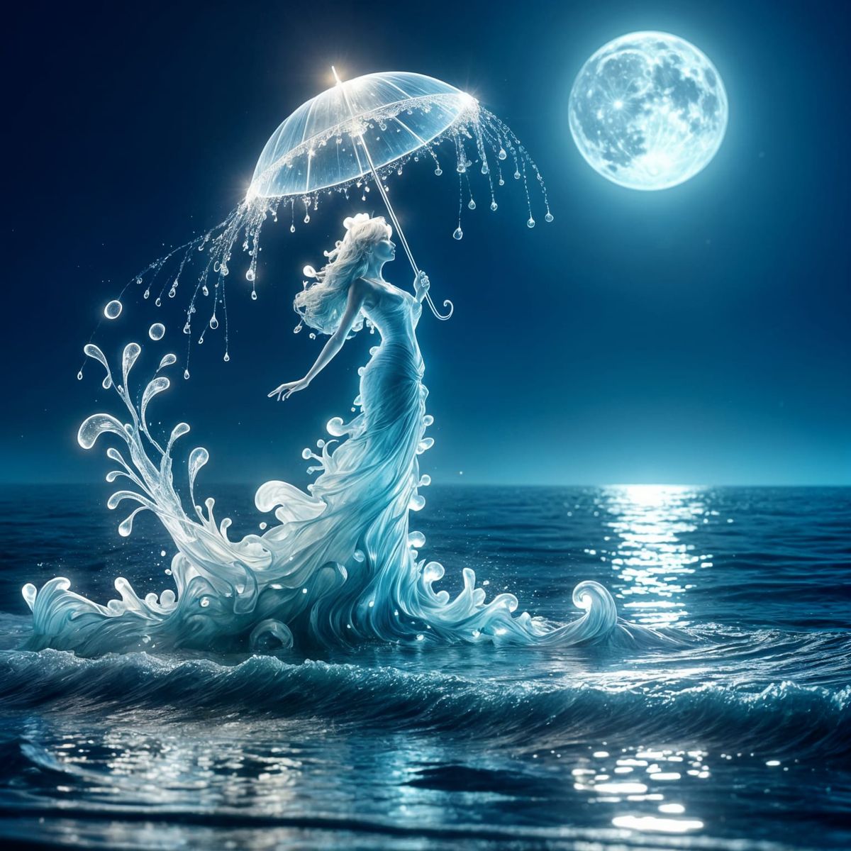 This image shows a water spirit emerging from the ocean under a full moon. The spirit, formed from water, holds an umbrella as droplets merge with the waves in an ethereal and otherworldly scene.