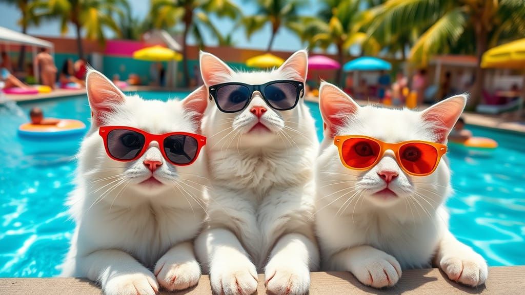 This image shows three white cats in sunglasses taking a selfie at a pool party. The vibrant scene is filled with summer colors, floaties, drinks, and people enjoying the fun in the sun.
