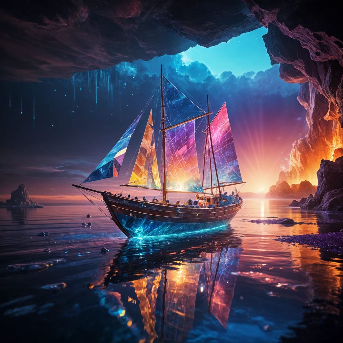 A surreal image of a crystal boat illuminated by refracted light. The light splits into vibrant hues, creating shimmering shadows and transforming the seascape into a dreamlike scene with gradients of blue, fuchsia, orange, and lilac.